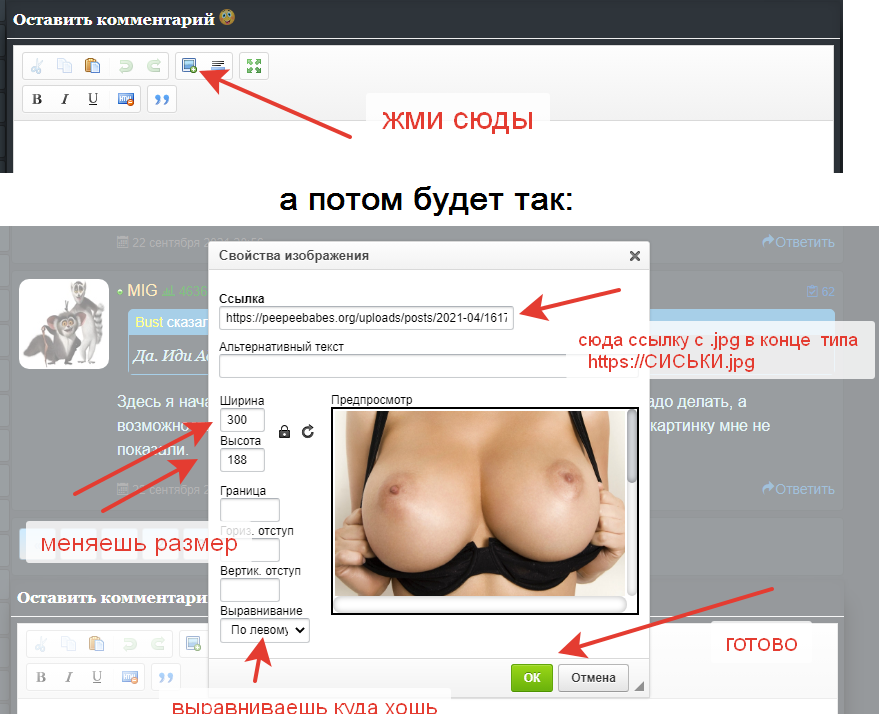 В редакторе текста выбираем "Изображение" (голубой мониторчик в иконках). Вставляем ссылку в верхнюю строку появившегося диалога для вставки, если все правильно, в окне превью появляется оплное изображение. Оно обычно большое, поэтому делаем ему адекватные рамеры, скажем, выставляя в первом размере 300 или 400 px (второй размер не трогаем, чтобы сохранились пропорции, он изменится автоматом). Границу делаем 1, отсутпы желательны 10-12 px, и выравнивание (оно позволит если надо тексту обтекать вашу картинку). Всеи зменения тражаюстя на превью. Если получившийся вариант в редакторе не устроил, двойной щелчок позволяет редактировать параметры вставки картинки до совершенства.
