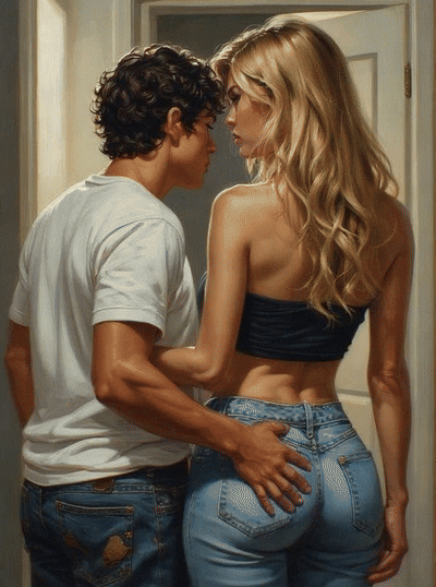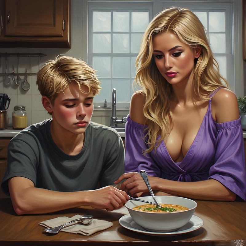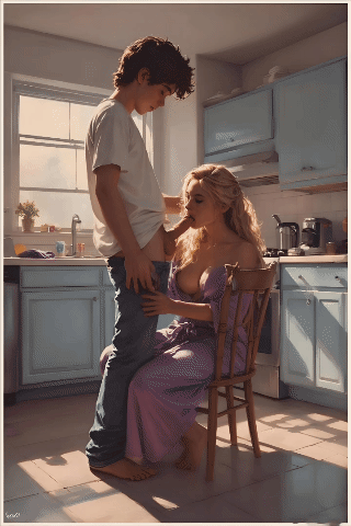 ![]() Предисловие: Этот рассказ написан под заказ, и я не являюсь автором данного сюжета. Нет, этим я не снимаю с себя ответственность за его качество, в конце концов, если бы он не представлял для меня хоть какого-то творческого интереса, я бы просто отказался от его реализации. Просто прошу учесть вероятность выхода из моего стандартного стиля изложения и подхода к событиям. Приятного прочтения! Часть 4. Глава 1. Дверь скрипнула, пропуская внутрь густой, маслянистый запах жареного лука, смешанный с терпким ароматом свежего чая. Воздух в прихожей был теплым, почти липким, пропитанным чем-то домашним. Ирина стояла в дверном проеме, облокотившись о косяк, ее тело расслабленное, но настороже, будто она ждала этого момента. Ее халат — тонкий, шелковистый, цвета спелой сливы — едва прикрывал бедра, распахнувшись при движении и обнажая полоску голой кожи. Под тканью угадывались контуры черного кружевного бюстгальтера, плотно обтягивающего полные груди, а между полураскрытыми полами халата мелькал соблазнительный изгиб живота, ведущий вниз, туда, где начиналось что-то еще более запретное. — Заходите, заходите… — ее голос был томным, чуть хрипловатым, будто она только что проснулась и еще не успела привести себя в порядок. Леха замер на пороге, ощущая, как ладонь Игоря упирается ему в спину, подталкивая вперед. — Просто поболтать зашли, — оповестил он, но его глаза уже скользили вниз, к глубокому вырезу халата, где между округлостей грудей темнела тень, а розоватые соски, набухшие от напряжения, вырисовывались сквозь тонкое кружево. Ирина улыбнулась, медленно повернулась, и халат разъехался, обнажив гладкую спину, переходящую в упругие ягодицы, лишь слегка прикрытые тонкой тканью трусиков. — Чай будете? — спросила она, переступая босыми ногами по линолеуму, каждый шаг заставляя ягодицы мягко покачиваться. — Да, спасибо, — ответил Игорь, опускаясь на кухонный стул и разглядывая ее, как мясник оценивает тушу перед разделкой. Тишину нарушал только звон ложек о фарфор. Ирина поставила перед ними сахарницу, наклонившись так, что декольте распахнулось, и оба мужчины могли разглядеть каждую деталь: кружево, плотно обтягивающее полные груди, розоватые соски, уже твердые от возбуждения. — Женек в школе? — спросил Леха, слишком громко, слишком резко. — Да… до вечера, — она улыбнулась, и в уголках ее губ затаилось что-то хитрое... Игорь потянулся за печеньем, но его пальцы скользнули мимо, коснувшись запястья Ирины. Она не отдернула руку. — У тебя руки холодные, — прошептала она, но не убрала свою. — Ты всегда можешь согреть, — он не спрашивал, он констатировал. Леха вдруг встал. Его дыхание стало прерывистым, а пальцы дрожали, расстегивая ширинку. — Что ты… — начала Ирина, но не закончила. Он вытащил член — уже твердый, вздувшийся, с каплей влаги на головке — и поднес к ее лицу. — Вот так сразу? — она фыркнула, но не отстранилась. Вместо ответа Леха провел пальцами по ее щеке, затем задел губы, заставив их приоткрыться. — Ты же знаешь, зачем мы здесь, — вкрадчиво сказал он. Ирина закатила глаза, но… медленно раздвинула губы, обнажив влажный розовый язык. Первое прикосновение было осторожным — кончик языка скользнул по головке, собирая каплю предэякулята. Затем губы сжались вокруг него, теплые, влажные, принимая его в себя. Леха застонал, когда ее рот обхва