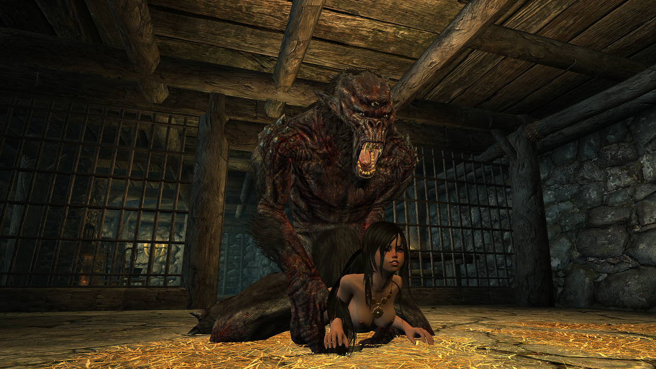 Придя немного в себя, Сакура дала знак Гунмару выпускать второе животное. Но тут всё пошло уже не по плану. Инстинкт существ затмил их не дюжий разум. Все двенадцать троллей, сбив ворота вольера вместе с Гунмаром, одновременно набросились на девушку. Сакура моментальна оказалась поднята с земли и насажена сразу на два члена, спереди и сзади. Чувствуя, что ситуация выходит из под контроля, Гунмар собрался было позвать арбалетчиков, чтобы спасти Сакуру. Но его остановила Серана. — Ямете кудосай! — Что? — Прошу остановись! Она выдержит. — Откуда ты это знаешь, вампирша? - Поддержала Гунмара Сорин Журар. — Я вижу. Я знаю. Я была одной из тысячи девочек, которых отдали в жертву Молаг Баалу. - Второпях затараторила Серана.- А он намного страшнее этих троллей. Даэдра подолгу насиловал каждую из нас. Почти все девочки умерли. Но те, кому удалось выжить, получили дар и стали высшими вампирами - Дочерьми Хладной Гавани. Я знаю, о чём я говорю. Мы были невинными, неопытными десятилетними детьми. А Сакура любимица Дибеллы и опытная зверо-сучка. Сорин Журар на минуту забыла о Сакуре, с ужасом рассматривая вампиршу, которой так и осталось десять лет с момента инициации. И не важно, сколько веков она уже живёт, или не живёт, если правильней сказать, на этом свете. — Ах ты бедняжка. Представляю, какой ужас тебе пришлось пережить. — Сейчас я ни о чём не жалею. Сейчас я высший могущественный вампир, который неподвластен времени и естественной смерти. — Что ж... Я рада, что ты на нашей стороне. Тем временем, тролли просто пустили Сакуру по кругу. Существа вертели, крутили и трахали полуживую девушку как хотели и куда хотели. Когда всё закончилось и тролли удовлетворили свою животную похоть, они сами вернулись в свой вольер. И даже сами восстановили выбитые ворота. — Пить... - Еле слышно произнесла Девушка, когда Гунмар на руках донёс её до комнаты Сераны. Да, Сакура теперь жила не в общем спальном зале, а вместе с Сераной, в отдельной комнате. Сделано это было специально для того, чтобы оградить её от навязчивого внимания ночных посетителей, на время, пока она приручает троллей и хаски. Бойцам Стражи Рассвета строго настрого было приказано - не мешать Сакуре отдыхать и восстанавливаться после сессий. Однако не смотря на приказ, нашлись несколько молодцев, которым приспичило глубокой ночью придти в комнату девушек. Серана заранее почувствовала приближение живой плоти, и ждала, пока сексуально озабоченные посетители не войдут. После чего, она открыла свои глаза, которые, в полной темноте, засветились ярко красным светом, и зловещим голосом произнесла: — Обожаю, когда еда приходит сама! Едва не обделавшиеся от страха парни в панике ломанулись на выход, сбив по пути загрохотавшее ведро со шваброй. А Сакура и Серана так прыснули от хохота, что спящий в своих покоях, на этом же этаже, Изран, испуганно вскочил, держа в руках боевой молот. *** — Как там дела с приручением троллей? - Поинтересовался как-то у Сакуры Изран. — Ещё три, или четыре сессии, и тролли будут готовы. - Отрапортовала девушка. — Это долго... Но это гораздо быстрее, чем я думал. Ты молодец! - Впервые похвалил Сакуру глава Стражи Рассвета. — Да. Дело в том, что мне, после каждой сессии, нужно несколько дней на восстановление. — Хорошо. Бери из наших складов всё, что тебе нужно. Любые зелья, ингредиенты... Сакура удивилас