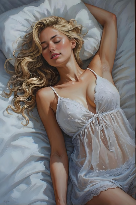 ![]() 8часть. Глава 1. Тишину перед спальней Дианы нарушил лёгкий скрип половиц. Дверь бесшумно приоткрылась, и Геннадий замер на пороге, затаив дыхание. Диана спала, раскинувшись на простынях, словно нимфа, выброшенная волной на берег. Её светлые волосы струились по подушке, будто шёлковый водопад, а густые ресницы, чуть дрогнувшие во сне, отбрасывали тени на бледные щёки. Приоткрытые губы дышали теплом, а тонкая ткань ночнушки подчёркивала каждый изгиб тела — округлости груди, хрупкую талию, мягкие бёдра…