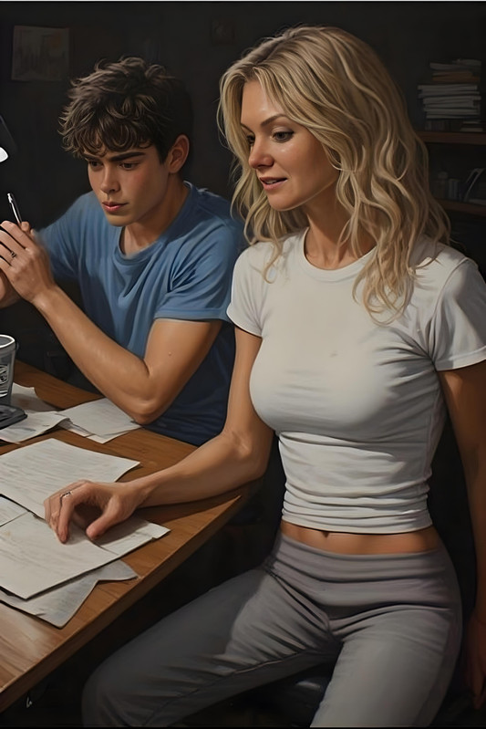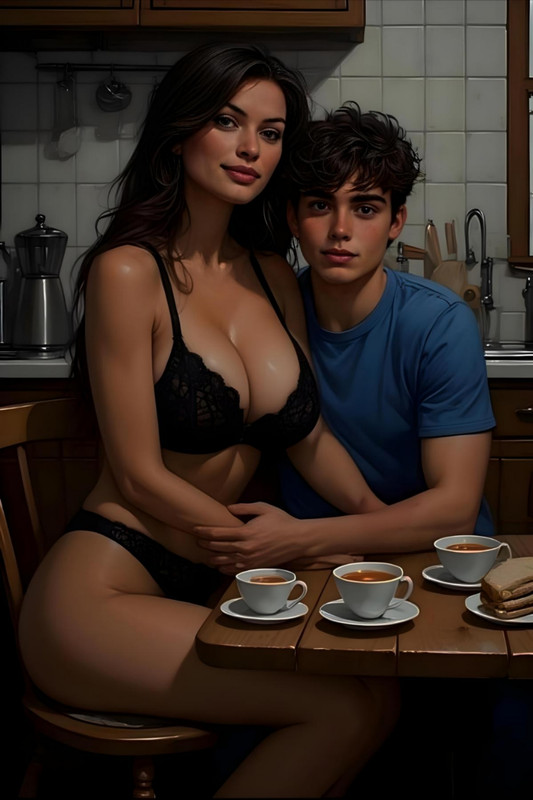 Денис хотел было ответить, но, хитро улыбнувшись, промолчал, предоставив слово Тане. Он прекрасно понимал, какой ценой ей дастся этот ответ. Татьяна сделала тяжёлый глоток, глубоко вздохнула и выдавила: — Всё в порядке... Я неудачно подвинула стул. Мы скоро закончим... ******* За ужином за столом собрались все трое. Алина наложила Диме и Денису свежеприготовленную лазанью — золотистая корочка сыра аппетитно хрустела, а между слоями пасты скрывался насыщенный мясной соус с пряными травами. Алина оживлённо рассказывала о своих учениках, передразнивая их забавные ответы на уроках, а затем перешла к обсуждению подготовки к завтрашнему Дню учителя. — То есть завтра придёшь поздно? — поинтересовался Денис. — Ну, скорее всего, да… Дима, улыбаясь, подхватывал разговор, делясь своими школьными новостями. Денис же молча ел, лишь изредка кивая в знак согласия. Он упомянул, что был на факультативе, но не стал вдаваться в подробности — да и тема была бы неуместной. Дима украдкой поглядывал на мать, ожидая, что она хотя бы словом напомнит о своём обещании, но Алина за весь ужин так этого и не сделала. Только ближе к ночи, когда оба парня уже легли спать, дверь их комнаты тихо приоткрылась. — Ты чего, тёть Алин? — Денис приподнялся на локте, щурясь от света из коридора. В проёме стояла Алина — и выглядела она… завораживающе. Чёрное кружевное бельё подчёркивало все её прелести, а мягкий свет ночника скользил по её коже, делая её силуэт одновременно нежным и откровенно соблазнительным.