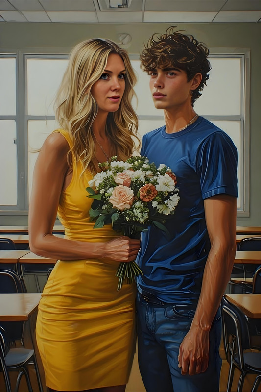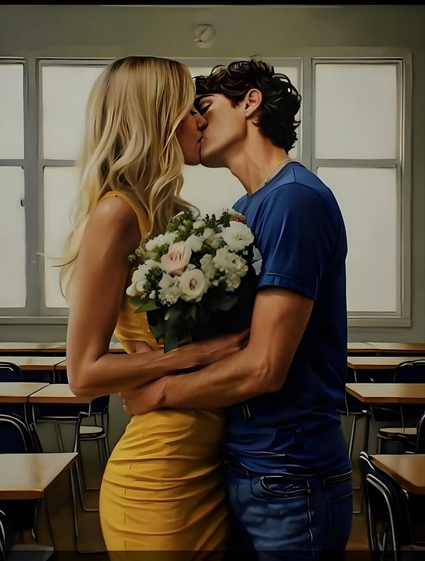 Дима с сомнением взял деньги. — А у тебя что за дела? — поинтересовался он. Денис, набивая рот яичницей, усмехнулся: — Видишь ли, праздник сегодня не только у Алины... У всех учителей! ******* Денис неспешно шагал по школьному коридору, сжимая в руке букет садовых роз. Пусть он и был небольшим, но выглядел роскошно — белые бутоны с вкраплениями алых цветов создавали контраст, делая его невинным и нежным. Замедлив шаг у кабинета, Денис осторожно заглянул в щель приоткрытой двери. Таня сидела за столом, задумчиво покусывая колпачок ручки. На ней было изящное облегающее платье жёлтого цвета — этот цвет идеально подходил её светлым волосам и лёгкому румянцу на щеках. Она что-то быстро записала в блокнот, слегка закусив губу от усердия. Вообще, наблюдать за человеком, когда он остаётся наедине с собой, — занятие увлекательное. В такие моменты можно заметить неожиданные жесты, несвойственные ему в присутствии других. Наедине с собой — человек становится настоящим. — Таня, привет! — широко улыбнулся Денис, переступая порог. Она подняла глаза, но почти не отреагировала. Лишь прохладно окинула его взглядом и снова опустила взор на бумагу. Денис подошёл ближе, слегка наклонился. — Ну ты чего, обиделась? — попытался он поймать её взгляд. — Да ладно, прекрати! Таня резко подняла голову, уже готовая выдать что-то резкое, но он опередил её: — Ладно, ладно, виноват, прости! — Он развёл руками, будто сдаваясь. — Но, с другой стороны… разве это было не круто? Да и вообще, хоть ты не хочешь признавать, я знаю — тебе тоже понравилось. Денис сразу понял — он попал в точку. В её глазах четко мелькнуло: он угадал. Но это же Таня — она никогда в этом не признается. — Дурак! — выдохнула она, но уже явно с более спокойными глазами.