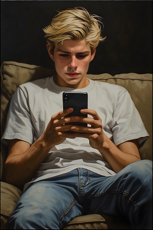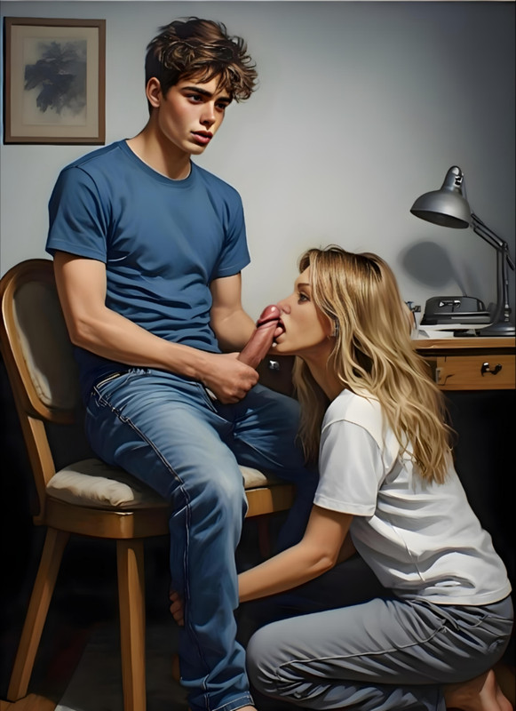 В комнату вошел Денис, потягиваясь, и наконец обратил внимание на брата: — Ну что, Федул, губы надул? — вспомнил он какую-то древнюю поговорку, плюхаясь в кресло напротив. — Да так… — буркнул Дима, даже не поднимая глаз. — Чего "да так" ? — Денис фыркнул. — Думаешь, я не в курсе, что ты все видел? Дима наконец оторвался от экрана. — Ты меня видел? — Я — видел. А вот тетя Алина, по-моему, нет. — Денис усмехнулся. — Я специально ей ничего не сказал. И сейчас мы с тобой этим воспользуемся. — Ты о чем? — озадачился Дима. — Как о чем? Самый простой способ манипуляции. У тебя есть козырь — ты можешь сделать ее виноватой и выжать из этого что-то полезное. Например… свежие фотки. Только на этот раз давить будем посильнее, надоело уже смотреть какой на ней лифчик. — Мда… ну ты... стратег, — Дима скривился. — Ты в шахматы играть не пробовал? — Пробовал. Неинтересно. — Денис махнул рукой. — Давай трубу сюда. Он выхватил телефон у брата, быстро нашел в мессенджере контакт под именем «Мама» и набрал: "Я с утра видел, что ты делала с Денисом на кухне… Зачем всегда все делать втихаря?!" Отправлено. Минуты потянулись мучительно медленно. Наконец пришел ответ: "Да просто так вышло, прости. Я вчера переборщила, влепив ему по лицу, и хотела извиниться". Денис торжествующе тыкнул экраном в лицо брату. — Видишь? Работает. — Он тут же набрал новое сообщение: "Через пять минут перемена. Можешь прислать что-нибудь мне? Ну, ты знаешь, что мне нравится". Тишина. Денис пристально смотрел на экран, Дима ерзал на диване, гипнотизируя стрелки настенных часов. Вжух! Новое сообщение. Фото. Просто сходу фото в ответ. Чисто конкретно, сразу к делу! Прекрасно! Алина стояла в пустом школьном классе, слегка прислонившись к учительскому столу. Блузка была расстегнута, обнажая гладкую кожу, а бюстгальтер, сдвинутый вниз, лишь слегка поддерживал ее шикарные груди. Свет из окна падал так ярко, что казалось, ее силуэт светился.