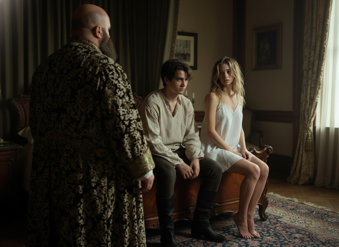 На следующий день послали Степана в лес хворосту набрать. Идёт он по тропке узкой, лес русский летний кругом — зелёный, густой, как ковёр бархатный. Воздух густой от хвои сосновой, от мха влажного, птицы щебечут в кронах, кукушка кукует где-то вдали, а под ногами шуршит листва, мягкая, как подстилка сеновая. Собирает Степан хворост — а в голове мысли о Кате милой, о теле её белом, о страхе вчерашнем. Вдруг хруст раздался за спиной, как будто ветка под ступнёй чужой сломалась. Оборачивается Степан резко, нож в руке сжал — никого, только кусты орешника шелестят да тень от облака по земле ползёт. "Померещилось, " — подумал он, плечами пожал, дальше пошёл. А через миг снова хруст, ближе, явственней. Обернулся — опять пусто, только листва дрожит чуть. Зато слышен смешок девичий, лёгкий, как ручеёк серебряный. "Катя..." — улыбнулся Степан, сердце забилось чаще, вспомнил он, как она любит подшучивать, прятаться в кустах. Идёт он дальше нарочно медленно, хворост подбирает, а сам уши навострил. Потом резко юркнул за дерево старое, сосну корявую, притаился, дыхание затаил. Слышит — приближается кто-то тихо, шаги лёгкие, как у кошки лесной. "Щас как схвачу!" — думает он, и выпрыгивает резко из-за ствола, хватает человека за талию, прижимает к себе крепко, шепчет: "Катя, миленькая, попалась!" А оказывается — не Катя то вовсе, а Любава, дочь барская приёмная. Смутился Степан до корней волос, отпустил он её мигом, руки отдёрнул, как от огня, щёки горят. А Любава смеётся, заливается, как колокольчик, глаза огромные, зелёные, блестят, волосы рыжие, непослушные, по плечам рассыпались. Знает Степан, почему она так улыбается — с детства они дружат, ещё с тех пор, как ребёнком её привёз барин в усадьбу, сиротинушку бедную. Вместе играли в прятки по сеновалам, вместе по лесу бегали, яблоки воровали в саду барском. Знал всегда Степан, что сохнет по нему Любава, вздыхает тайком, подарки мелкие дарит — то венок из ромашек, то яблоко румяное, — а он только по-братски её жалел, Катю любя.
