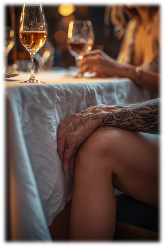 «Господи, — подумала она. — Он сейчас... при всех...» Игорь рассказывал про колёса, про давление в шинах, про то, что надо заехать на шиномонтаж заранее. Дима кивал, залипая в телефон. Оля увлеченно обсуждала с Лерой, какие продукты взять в дорогу. А под столом палец Макса вошел в неё.